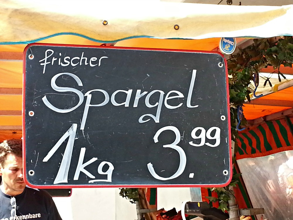Whenever you enter a German supermarket or farmer’s market in spring, you’ll see signs along these lines everywhere: FRISCHER NÜRNBERGER SPARGEL! (fresh Nuremberg asparagus!) It might seem a bit aggressive – and to be fair, sellers urging you to buy Spargel can seem over-the-top, too. But that’s how spring works, vegetable-wise.